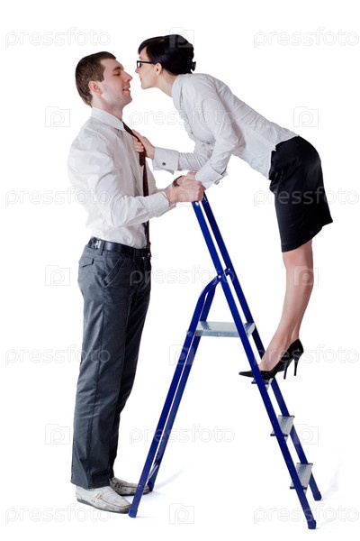 Мужчина и женщина на стремянке в деловой одежде на белом фоне