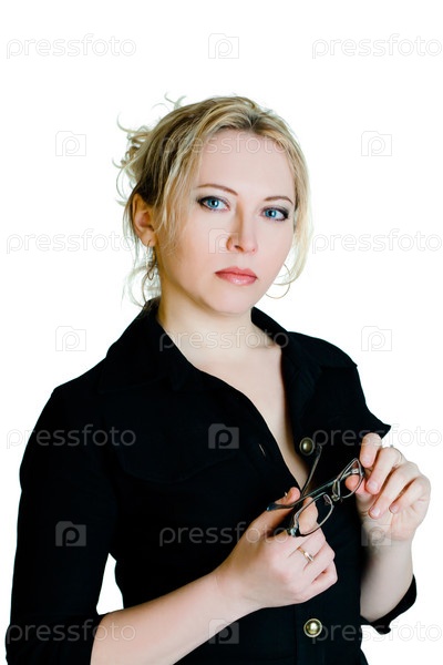 Девушка держит очки в руках на белом фоне