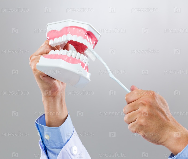 Стоматолог держит слепок зубов и щетку