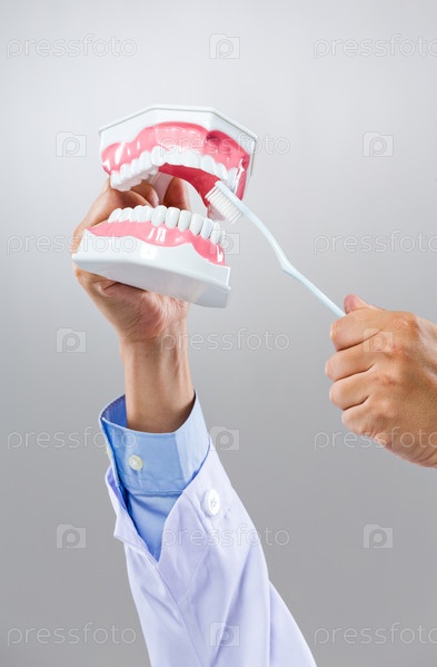 Стоматолог держит слепок зубов и щетку