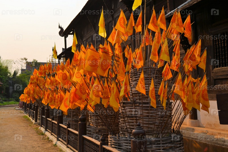 Оранжевые флаги с Буддийский символ перед храмом, Чианг Май, Таиланд
