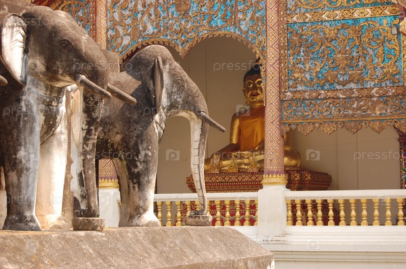 Скульптуры слонов и статуя Будды Чиангмай, Таиланд