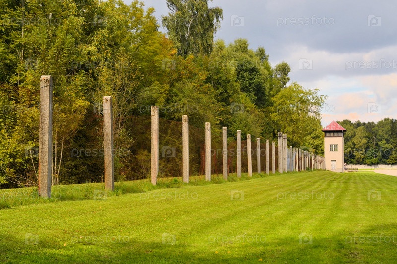 Забор и сторожевая башня в концентрационном лагере Дахау