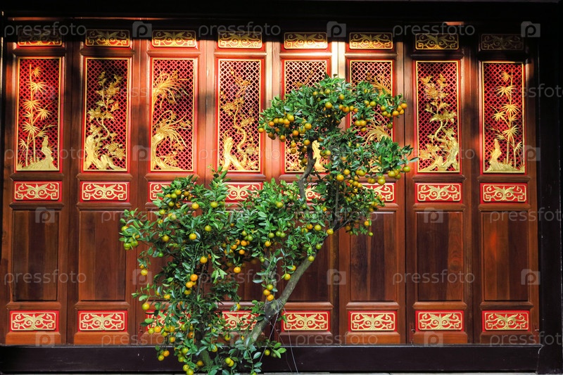 Апельсиновое дерево перед дверью, буддийский храм, Сайгон, Вьетнам