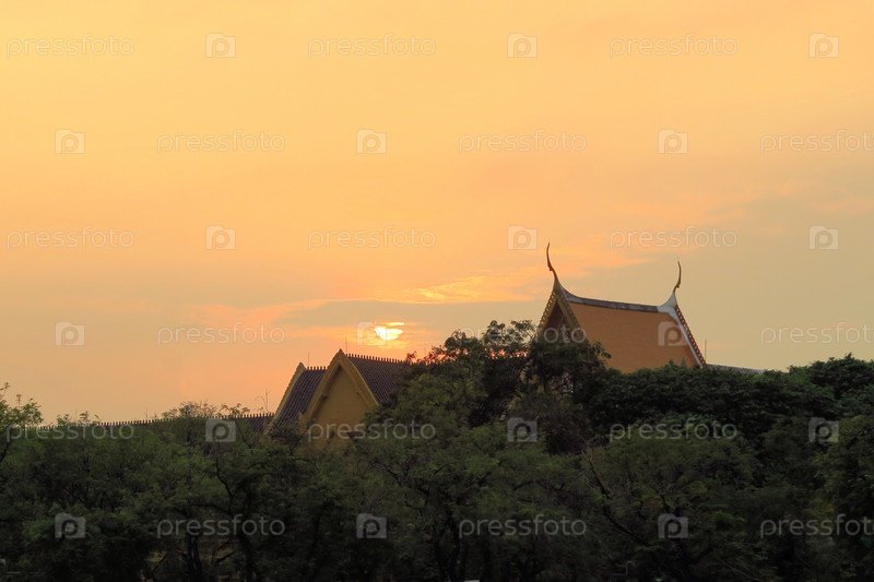 Солнце садится за буддийский храм, Бангкок, Таиланд