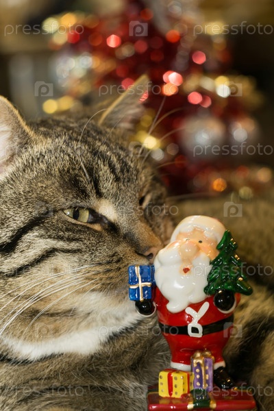 Кошка с игрушечным Сантой