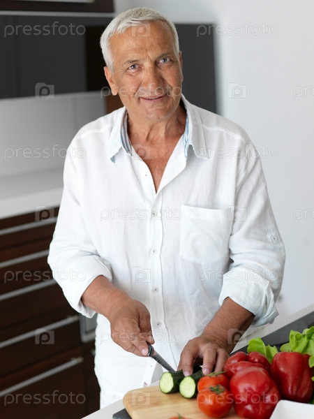 Мужчина готовит салат на кухне