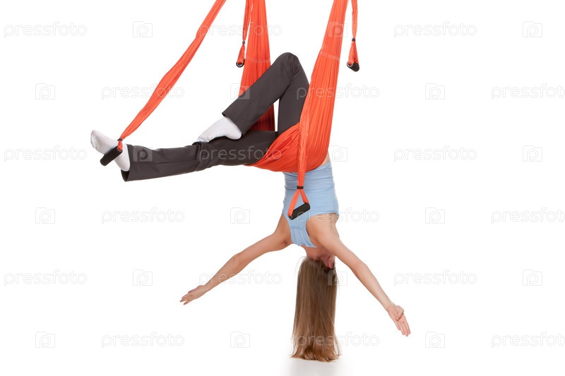Девушка делает растяжку на тросах для йоги