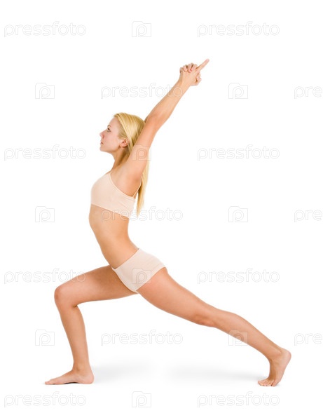Профильный вид спортивной женщины, выполняющей упражнения для растяжения изолированно на белом фоне