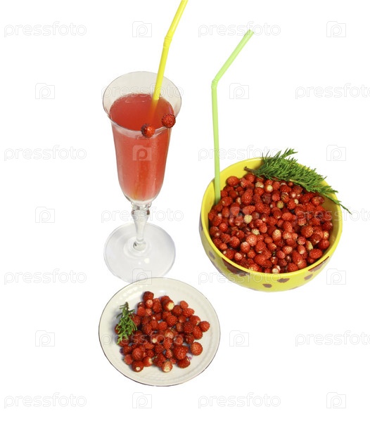 Две тарелки с земляникой и бокал с соком на белом фоне