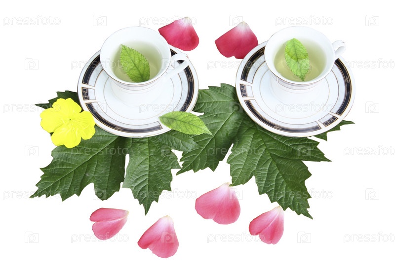 Чашечки цветочного чая с листьями
