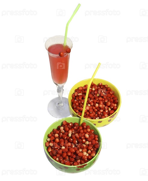 Две миски с земляникой и бокал с соком на белом фоне