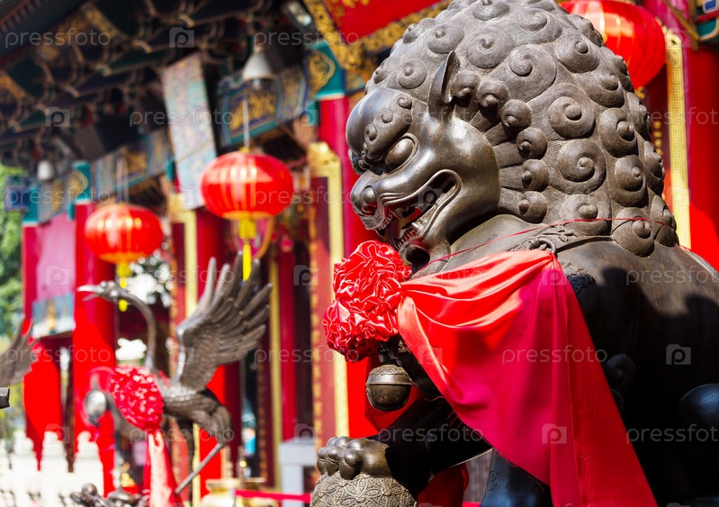 Статуя льва перед китайским храмом
