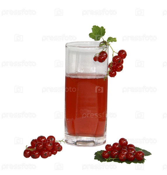 Стакан с морсом и ягоды красной смородины на белом фоне