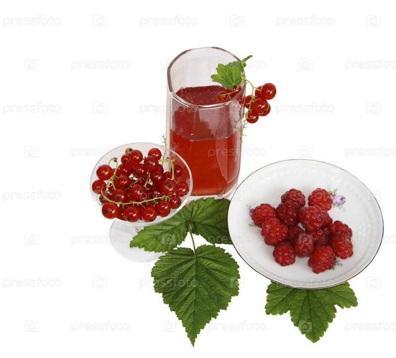 Стакан с морсом и ягоды смородины и малины на белом фоне