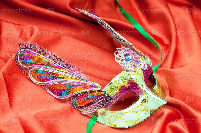 Яркая маскарадная маска на красном шелке