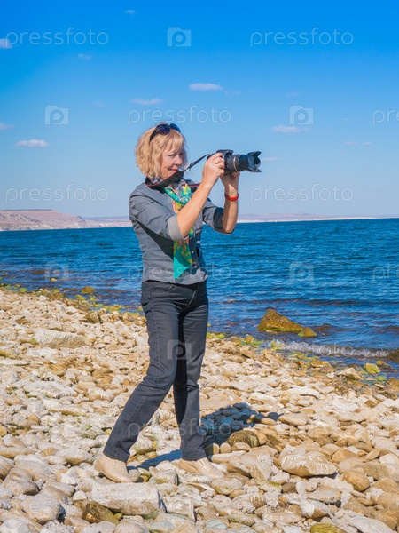 Симпатичная женщина средних лет с фотоаппаратом снимает водные пейзажи Волгоградского водохранилища