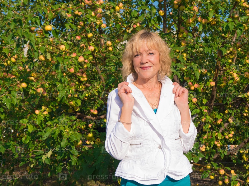 Женщина средних лет стоит на фоне яблони со спелыми яблоками