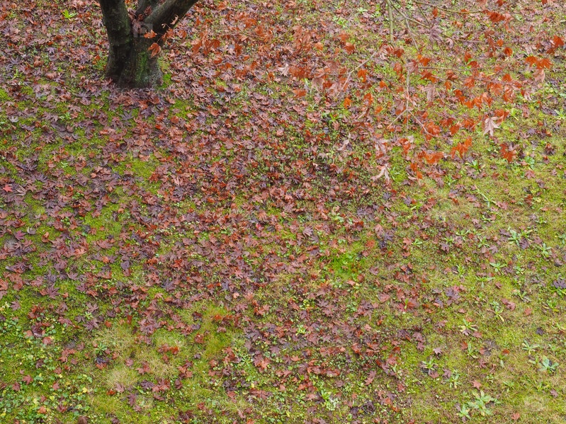 Зеленый газон с опавшими листьями