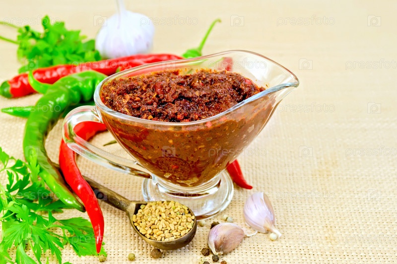 Аджика в стеклянном соуснике с чесноком на мешковине