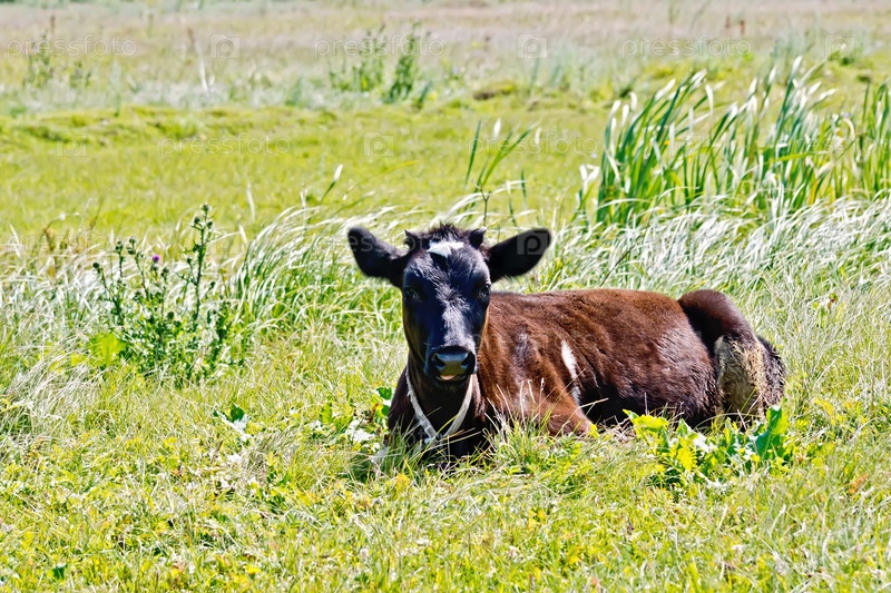 Теленок лежит на траве