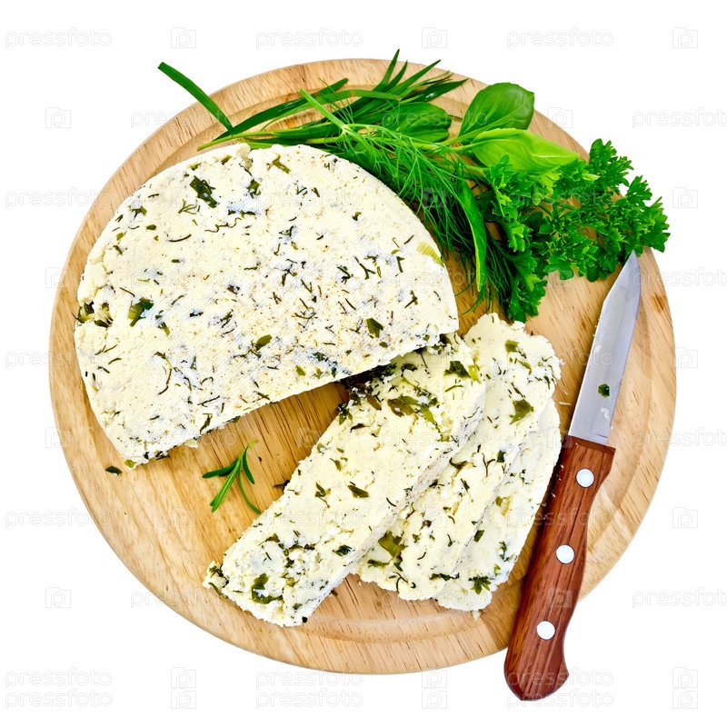Сыр с ножом и зеленью на круглой доске