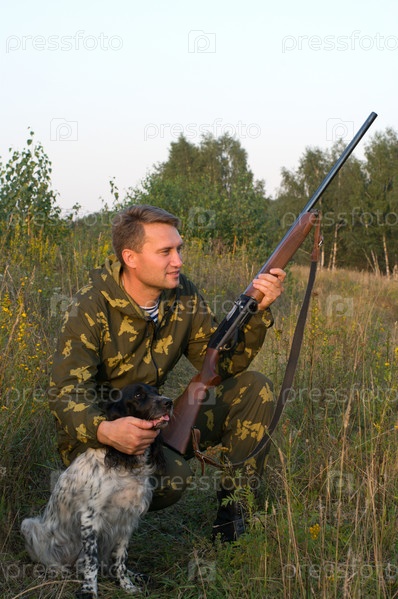 Мужчина в камуфляже с ружьем и русским спаниелем