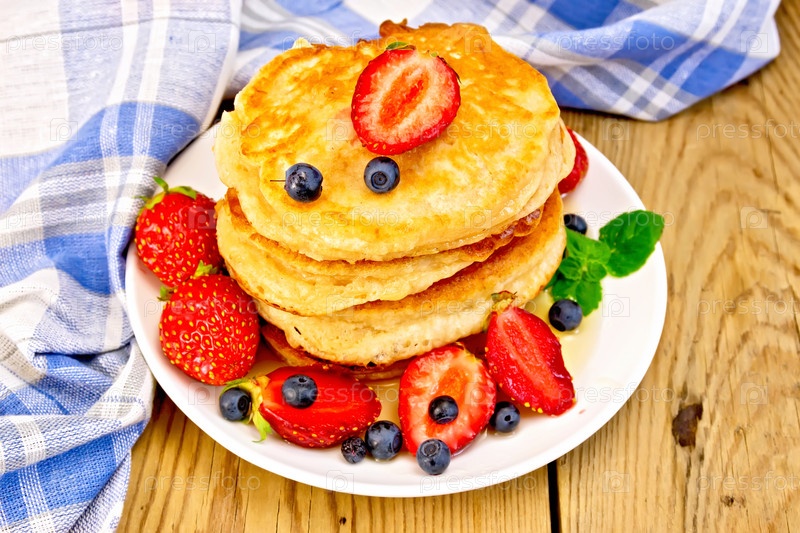 Оладьи с клубникой и черникой на доске