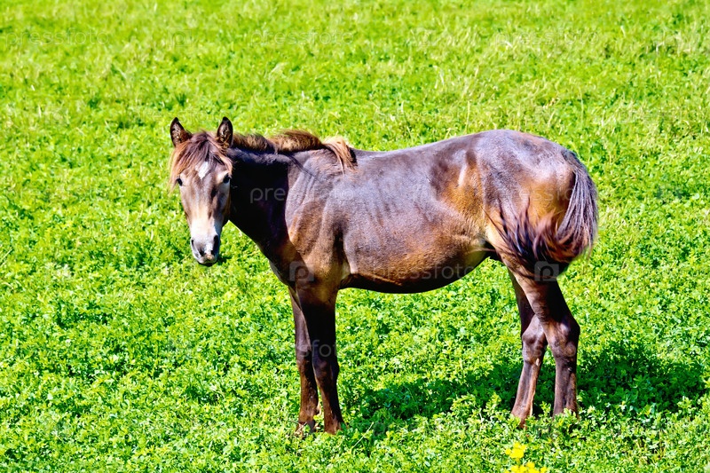 Коричневая лошадь на траве