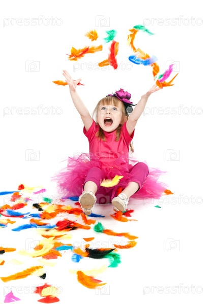 Девочка в розовом платье бросает перья на белом фоне