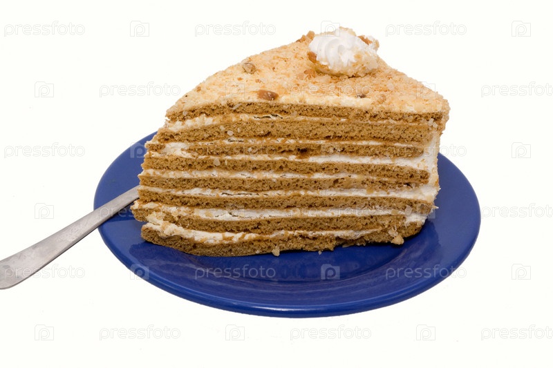 Медовый торт на синей тарелке с ложкой на белом фоне