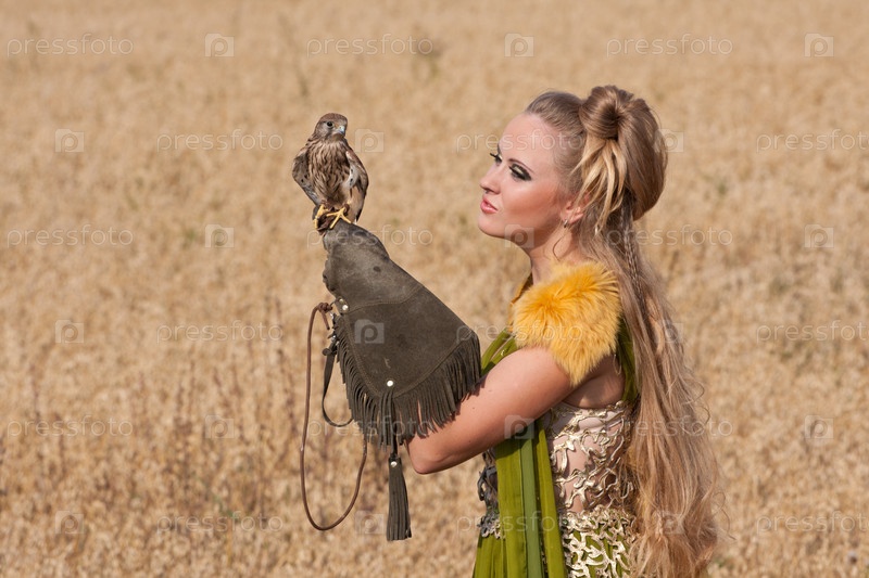 Девушка с соколом на руке в поле