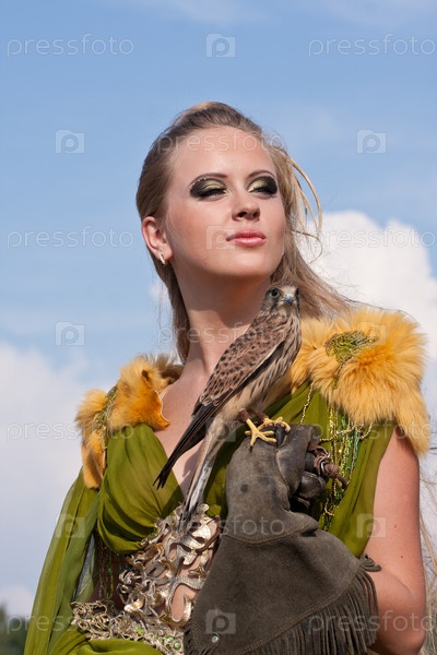 Девушка с соколом на руке на фоне неба