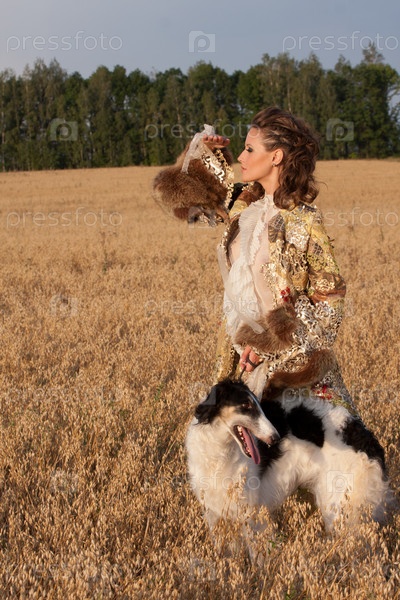 Девушка в одежде 18 века с борзой в поле