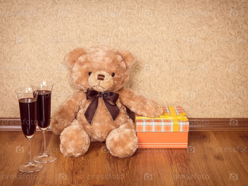 Мягкая игрушка, подарочная коробка и бокалы вина