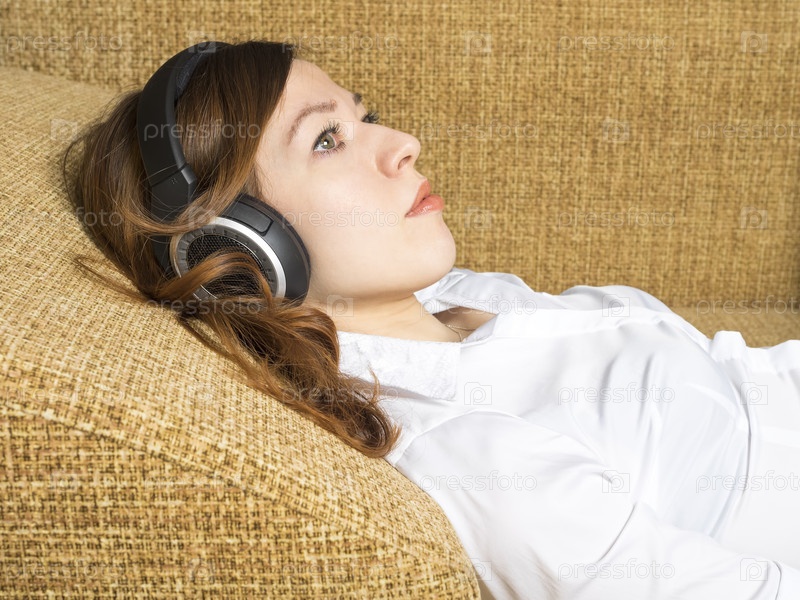 Девушка на диване слушает музыку