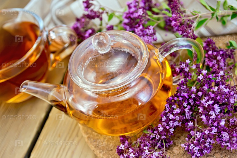Чай из душицы в стеклянном чайнике на доске