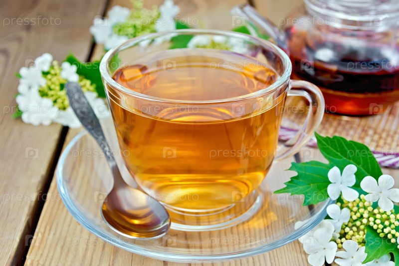 Чай из цветов калины на деревянной доске