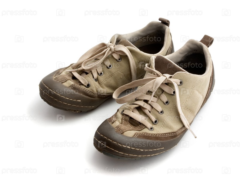 Пара старых кроссовок на белом фоне