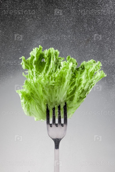 Листья зеленого салата на вилке