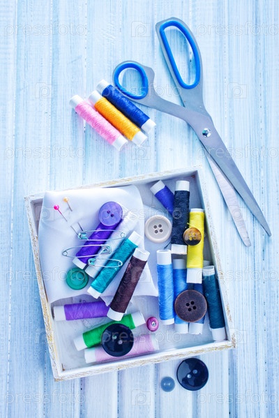 Ножницы, шпульки ниток и иглы