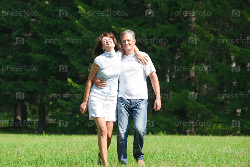 Счастливая семейная пара гуляет в летнем парке