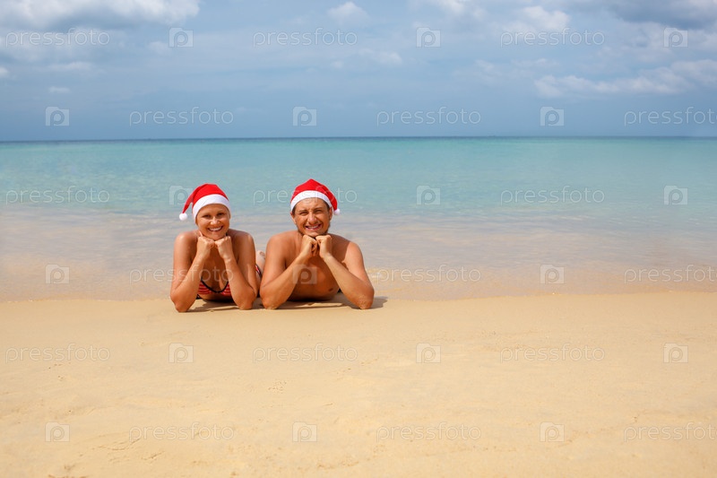 Пара в шапка Санты на тропическом пляже