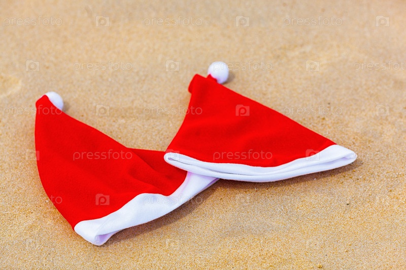 Новогодние колпаки лежат на песчаном пляже