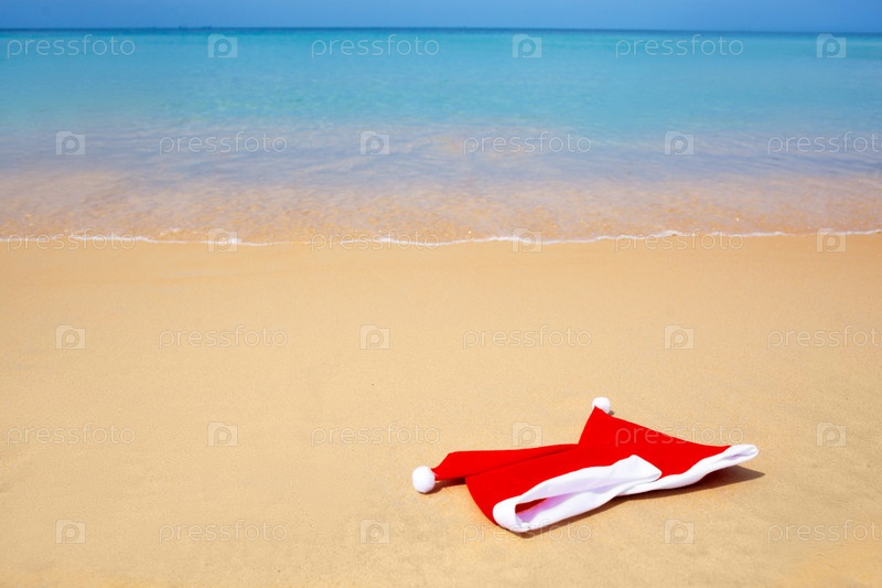 Новогодние колпаки лежат на песчаном пляже