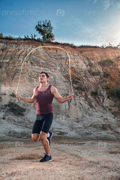Спортивный мужчина прыгает через скакалку на свежем воздухе
