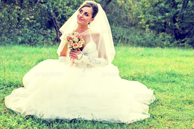 Счастливая невеста сидит на зеленом лугу