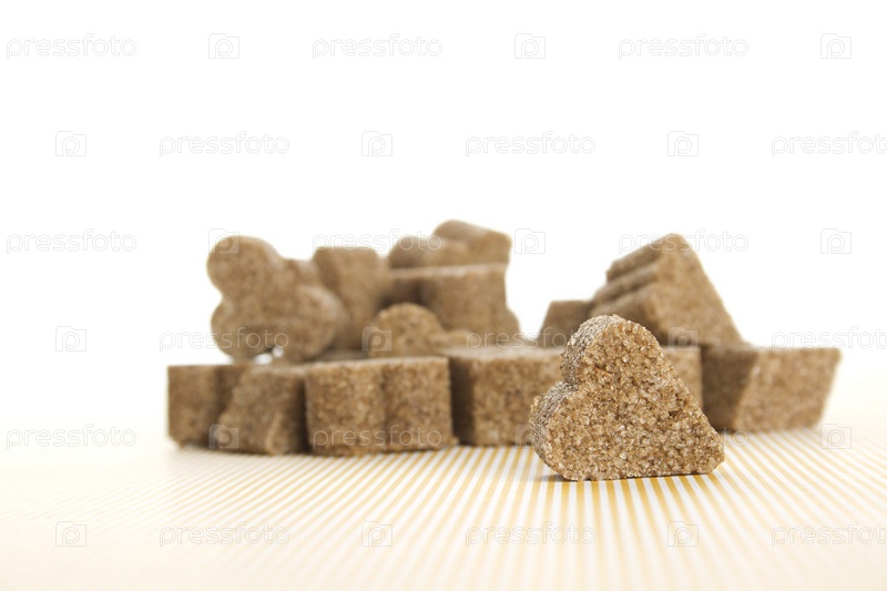 Кучка кубиков коричневого сахара в виде сердечек
