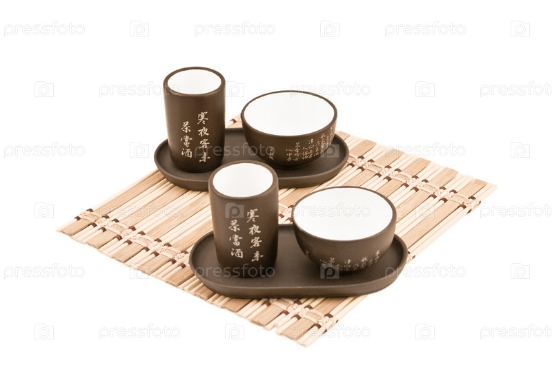 Набор для китайской чайной церемонии на циновке на белом фоне