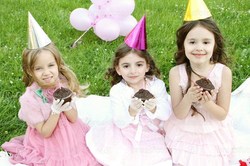Три маленькие девочки в праздничных костюмах с пирожными в руках